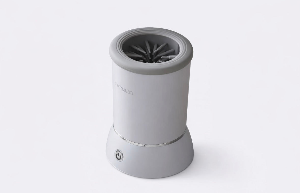 Limpador elétrico de patas que remove lama, areia e sujidade em segundos. Prático, silencioso e perfeito para manter a casa limpa após os passeios.